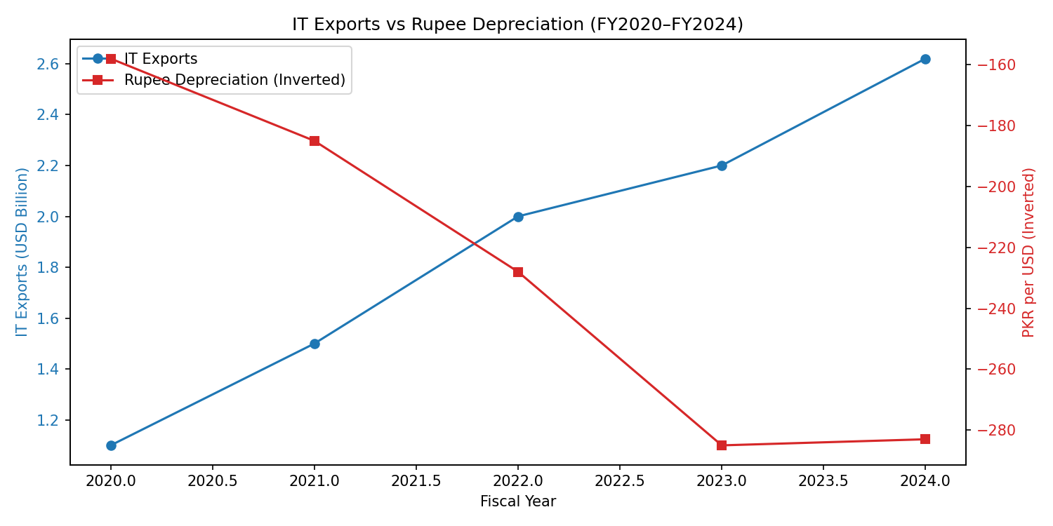 Notice the pattern? The steepest export growth (FY2021–FY2022) happened precisely when the rupee was plummeting fastest. Even during Pakistan’s worst economic crisis in decades (2022–2023), IT exports kept climbing—unlike textiles, agriculture, or remittances, which all faced headwinds.